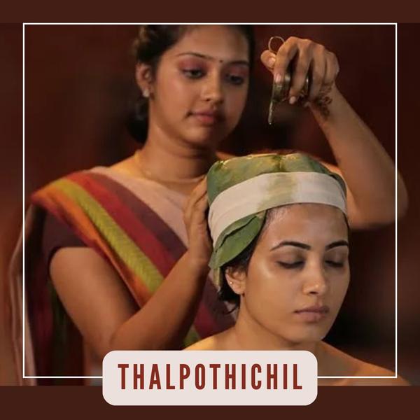 Thalapothichil, also known as “Shiro Lepana,” is a traditional Ayurvedic therapy in which the scalp is covered with a thick layer of medicated herbal paste. The therapy is specifically designed to calm the mind, cool the head, and address mental stress, headaches, and other scalp-related issues. It balances Pitta dosha, which is responsible for heat and inflammation in the body.Benefits:● Cools the Head: Reduces excess heat in the body by balancing Pitta dosha.● Relieves Stress: Alleviates anxiety, stress, and mental fatigue.● Improves Sleep: Treats insomnia and promotes deep, restful sleep.● Reduces Headaches: Effective for migraines, tension headaches, and dizziness.● Enhances Scalp Health: Nourishes hair roots, reduces dandruff, and improves hair growth.For optimal results, the therapy is performed for 7 to 14 days, depending on the individual's condition.Thalapothichil therapy provides holistic mental relaxation, physical cooling, and scalp rejuvenation, making it ideal for modern-day stress and heat-related ailments